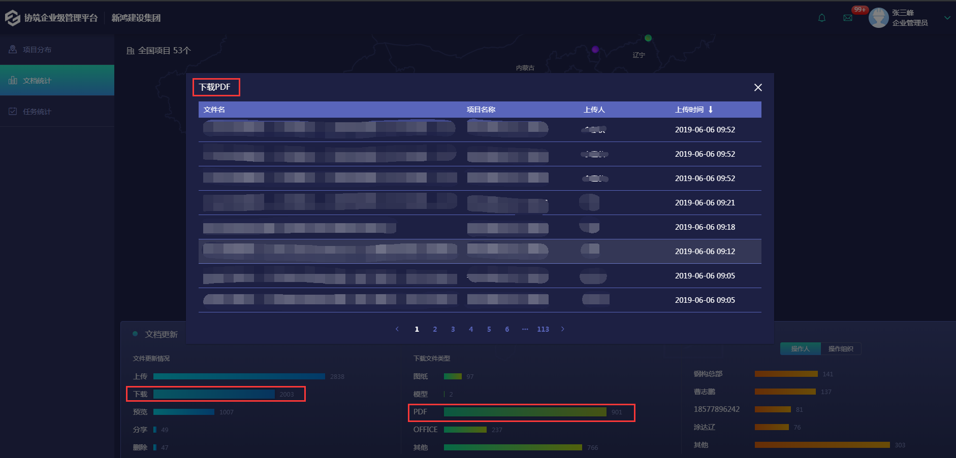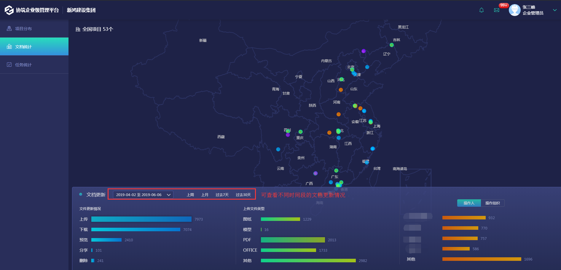 文档统计页面,按照地区统计企业下属项目文昂的更新情况,并按照操作分类、文档类型、具体操作人/操作组织进行详细统计。