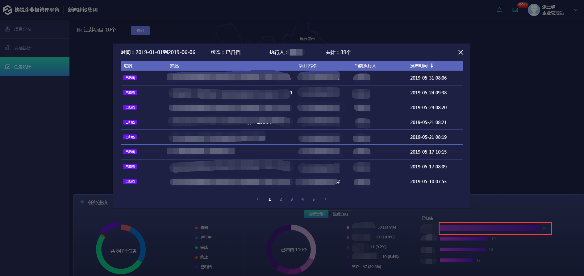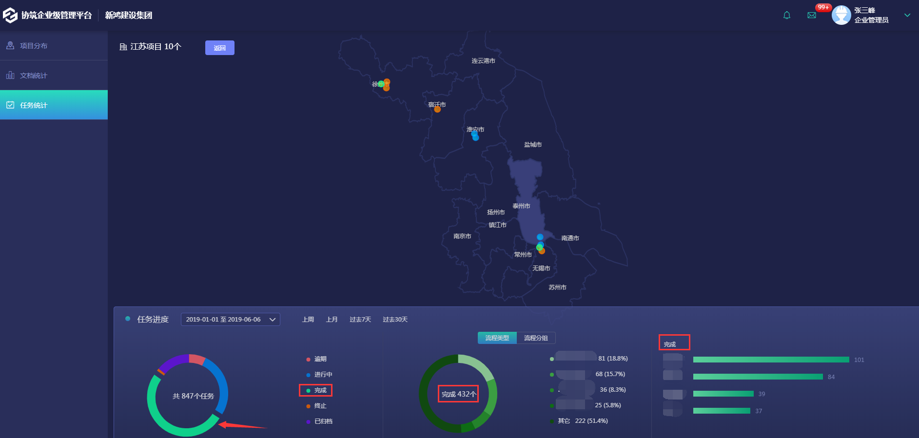 任务统计页面按照地区统计企业下属项目任务的更新情况,并按照任务状态、流程类型和当前执行人进行归类显示。
