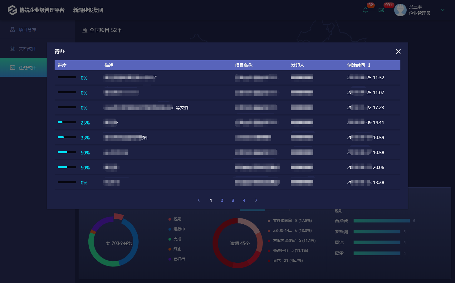 该列表汇总展示了企业下属所有项目分配给当前用户的任务,并支持直接在列表中打开和查看处理详细任务。